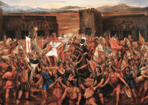 By mid-afternoon, lookouts saw the Inca leave his camp with a large retinue of unarmed warriors, for the Inca bet on numbers to capture the bearded men alive. He was eager to show the Andean supreme deity Viracocha and the people of the empire that no god or man could ever stand or defeat him. He arrived at the plaza on his golden litter held by courtesans, protected by bodyguards and a compact group of unarmed warriors to display his apparent peaceful intent. Calling for the Spaniards, he sent unarmed scouts to find out where they were. They reported that the bearded ones were hiding in nearby sheds around the plaza. The Inca was about to order a more forceful investigation when Dominican Friar Vicente de Valverde, chaplain of the army, pushed his way through the throng to the Inca’s litter with Martinillo, also from the 1526 encounter off Tumbes as translator, screaming God’s name to the heretics while brandishing the Holy Bible.