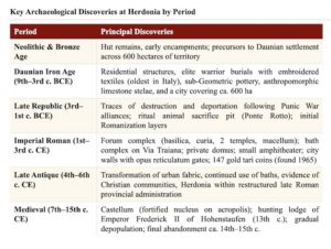 Second, Herdonia’s chronological depth is exceptional. The site documents human occupation from the Neolithic through the late mediaeval period—a sweep of roughly eight thousand years—in a landscape whose geological stability and agricultural productivity have largely preserved the stratigraphic record intact. Few Italian sites offer this combination of chronological range and physical accessibility.