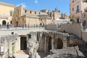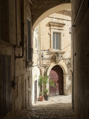 Above ground, the city’s social life also begins in civic space. Piazza Vittorio Veneto (see more about this below), the standard launching point for visitors, offers a snapshot of layered history: fountains that once served as essential water sources and, inevitably, social centers; palaces and churches whose façades display Romanesque and Gothic vocabulary; and a dense concentration of institutions that signal Matera’s role not only as a wonder of survival but as an administrative and cultural hub. Here, the “official” city touches the older, carved city—the moment when you step from a typical Italian square into the labyrinthine descent of the Sassi, and the centuries begin to stack more visibly.