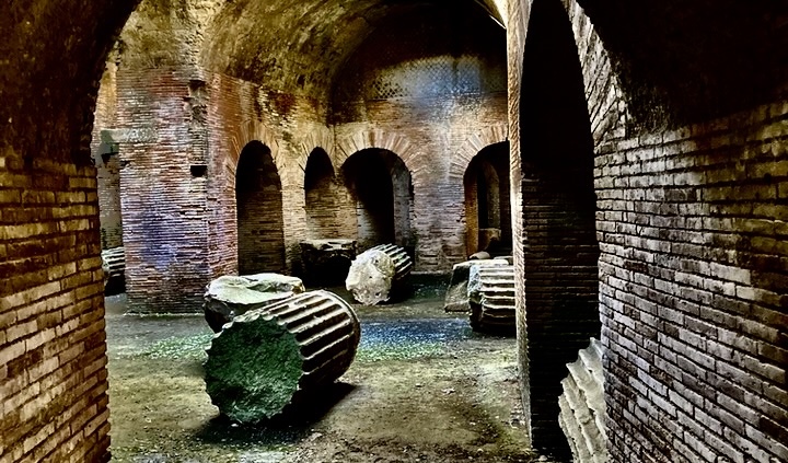 One of the grandest amphitheaters of ancient Rome, the Flavian amphitheater of Pozzuoli is considered the third largest after the Colosseum in Rome and the Amphitheater of Capua. With a historic capacity of 50,000 spectators, it measures 482 x 384 feet, with the arena floor alone at 237 x 139 feet. One is impressed first by the exterior remains towering above, reddish brickwork providing a contrast with other grey-hued structural elements. Stepping down into its subterranean spaces, one enters a world unto itself, a massive system of arches, chambers, walls and fallen pillars, left as if the ancient inhabitants had just abandoned the spaces only the day before. It was difficult to believe the almost pristine freshness of the stone and brickwork. Hidden, protected from the ravages of human activity and weathering above ground level over the centuries, it seemed, like Pompeii and Herculaneum, frozen in time. One could still easily imagine the sight and sounds of the sets, animals, and other equipment and devices in play within the cool spaces, now mostly empty, as workers made preparations for the pending performance. In my mind’s ear, a somewhat muted ancient roar of the sitting crowds above could be heard.