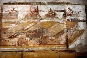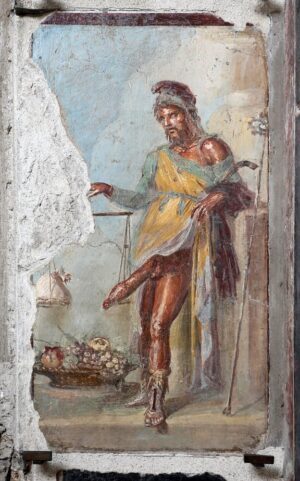 These wall paintings were found in 1986[1] in the newly excavated Suburban Baths. The paintings are dated to 62 to 79 CE. Sailko, CC BY-SA 4.0, Wikimedia Commons