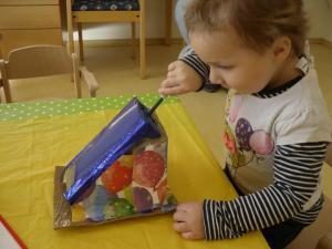 In one of the twelve tasks, children needed to use a stick as a lever to retrieve pom poms from a small box. Similarly, great apes use twigs to remove kernels from nuts or seeds from stingy fruits. The tasks could only be solved by using a tool, but children were not told that.