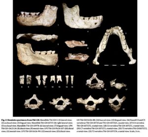 It was in 1969 when Philippe Beriro, a collecting hobbyist, discovered what turned out to be the partial mandible of a hominin on a sloping surface below the cave, in addition to lithic and other mammal fossils. But it wasn’t until 1994 when controlled excavations, carried out over a period of more than two decades, uncovered stone artifacts of the Acheulean industry, more mammal fossils and, most significantly, additional hominin fossils within a well-defined stratigraphic context. Abundant carnivore remains, coprolites and other unmodified mammal bones, along with the scarcity of lithic artifacts, all indicated a carnivore den context. The hominin fossil assemblage included an adult mandible, eight hominin vertebrae and a hominin mandible fragment that forensic analysis showed to be a 1.5 year-old child. Finds also included a partial hominin femora that investigators determined to have been scavenged by a large carnivore, likely a hyena.