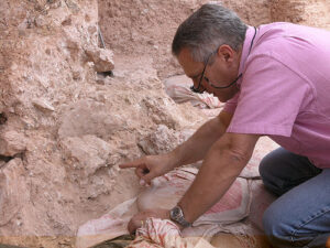 Dr. Jean-Jacques Hublin on first seeing the new finds at Jebel Irhoud. He is pointing to the crushed human skull (Irhoud 10) whose orbits are visible just beyond his finger tip. Credit: Shannon McPherron, MPI EVA Leipzig, License: CC-BY-SA 2.0.