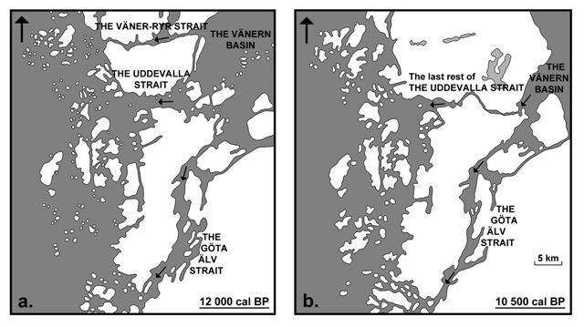 Fig. 3 – Isostatic rebound in the archipelago of central Bohuslän not only provided for increased land area in the form of additional islands, it also closed the straits connecting Vänern Basin with the sea at ca. 10,500 cal. BP. Compare maps (a) and (b). Arrows in the straits indicate the direction of flow for glacial melt water on the surface while a bottom current of heavier seawater, moved in the opposite direction – in the same strait. The mixing of these two currents took place around islands in the archipelago i.e. “islands wakes”.