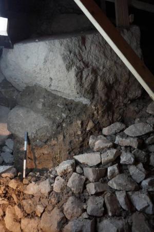 Eventually, we identified three substantial occupational areas and a possible fourth distinct fortification site. Each contains dense period-specific cultural material and architecture, with corresponding monumental walls containing varying stages or phases of occupation. Immediately south upon an isolated hill, lies a possibly related church complex where we discovered a series of pre-Christian funerary monuments with inscribed, monumental stones, deliberately toppled stone stelae, and a series of well-built, rectangular, architectural elements. The current church sits atop a much larger, older foundation. Medieval pottery remains in-situ in cuts along the road to the church.